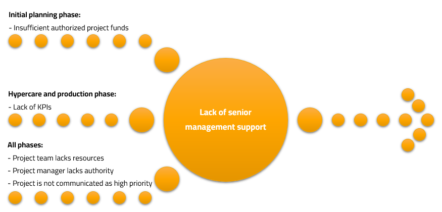 In the initial planning phase of the project, the absence of senior management support might cause budget-related issues. If the senior management does not consider the project as a priority among others, then it is likely that it will be launched with a limited budget that does not allow to cover the original scope of the project. For instance, certain developments would not be carried out by professional experts but by trainees; or the project team has to cancel certain developments; or not enough licenses per user would be purchased.