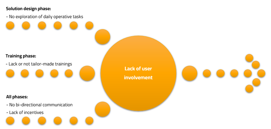 In the solution design phase, the internal process modelling might not stem from the individual employees but from the supervisors or only from industry best practices. This way, the operative tasks are not assessed properly, and the users are not involved in the cooperative work with the project team.