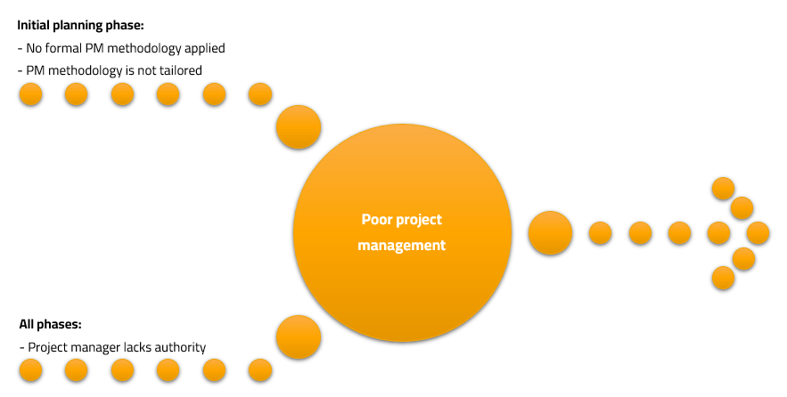 A triggering factor for poor project management throughout all phases of the project lifecycle might be that, although the enterprise endorsed the usage of a formal methodology, the project manager has no adequate authority. Such a scenario might stem from the functional or weak-matrix organizational structure, in which project managers lack authority, cooperation with functional managers is limited, and stakeholders underprioritize project contribution by their individual functional goals (Siriluck, 2010).