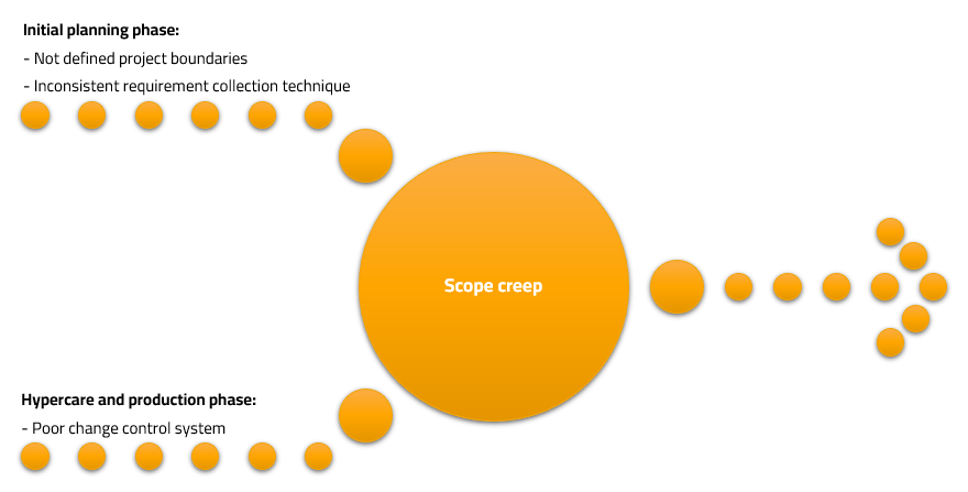 Scope or requirement creep is an often-referred expression for adding unauthorized deliverables to a project timeline that affects resource and time utilization. The risk of scope creep is that the project will not finish by the predefined timeline, or it will face a cost overrun. According to Dey, Bennett and Clegg (2021), scope creep has a high impact on implementation projects. Scope creep mainly occurs in two large phases: in the initial planning and during the production phase.